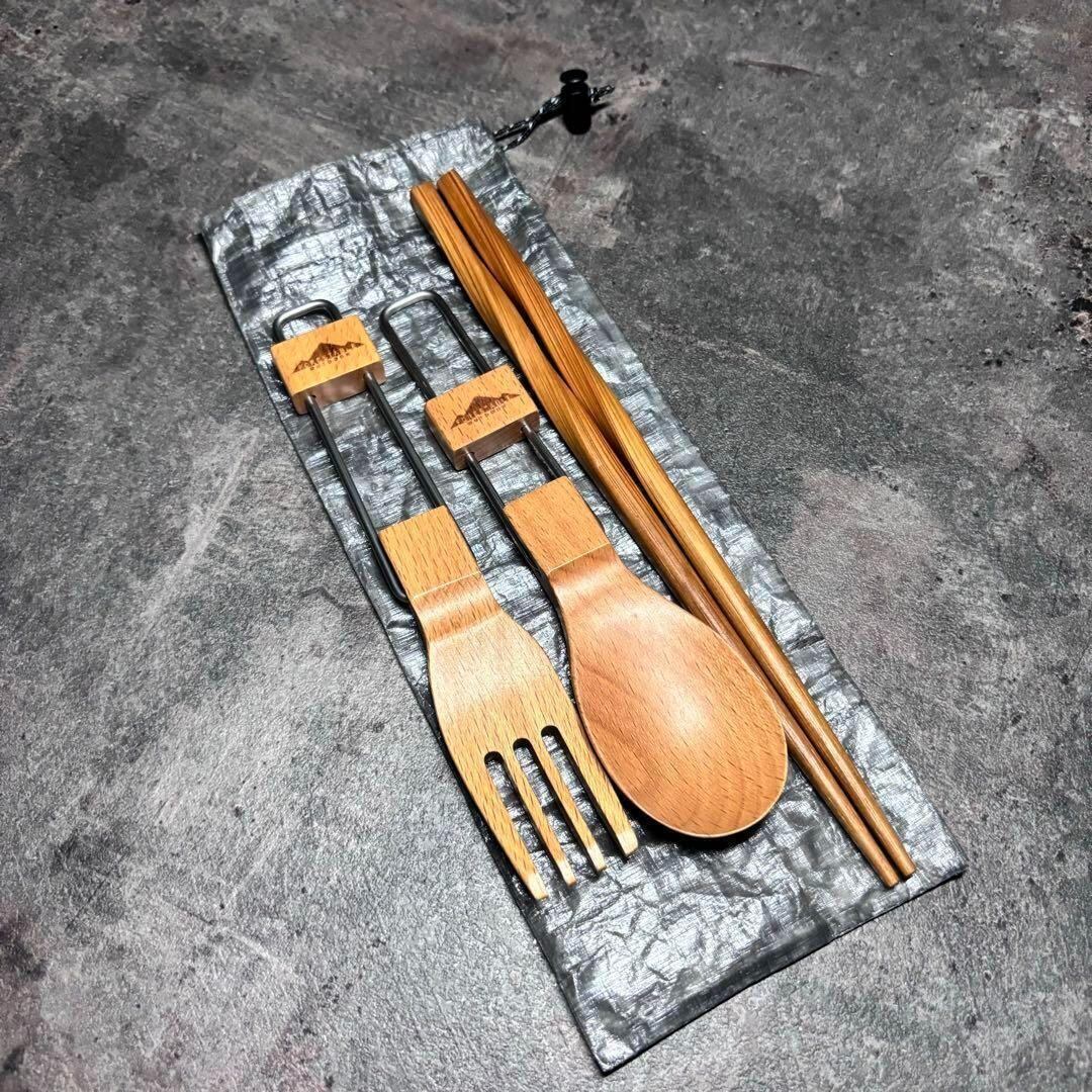 ソロ用の箸、スプーン、フォークを収納したり、ペグケースなどに便利です。紐通し口はハトメを使用しているので縫い付け仕上げよりも強度があります。