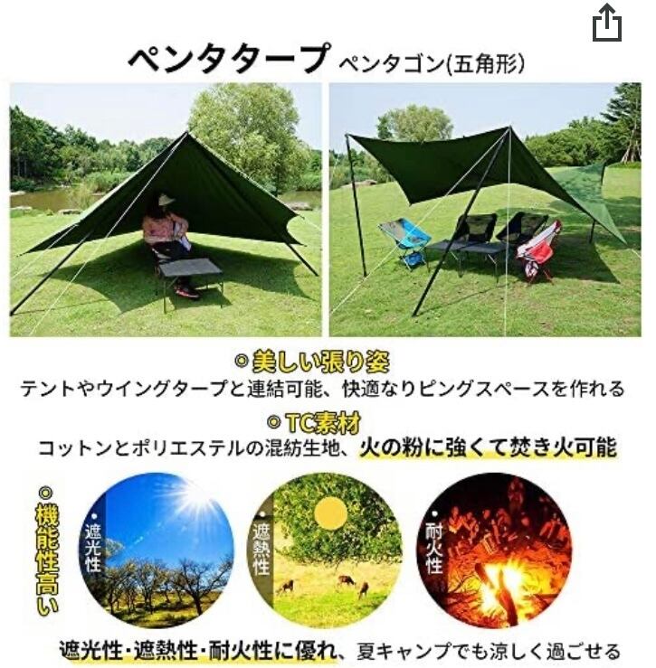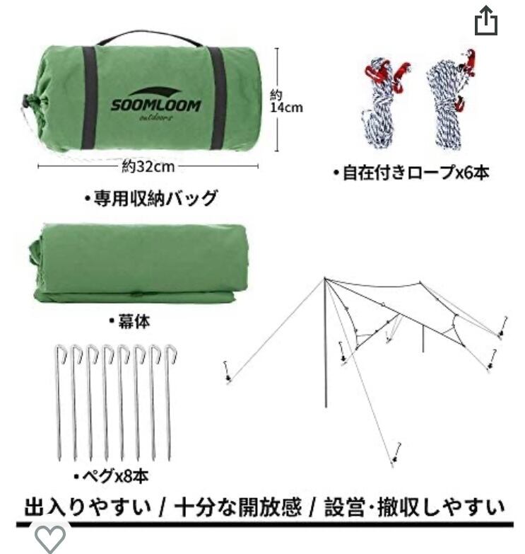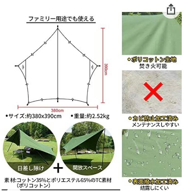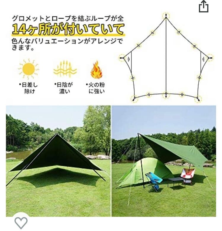 サイズ:大きいサイズ380cmx390cmのペンタゴン形となっています。グロメットとロープを結ぶループが全14ヶ所が付いていて、色んなバリュエーションがアレンジできます。
